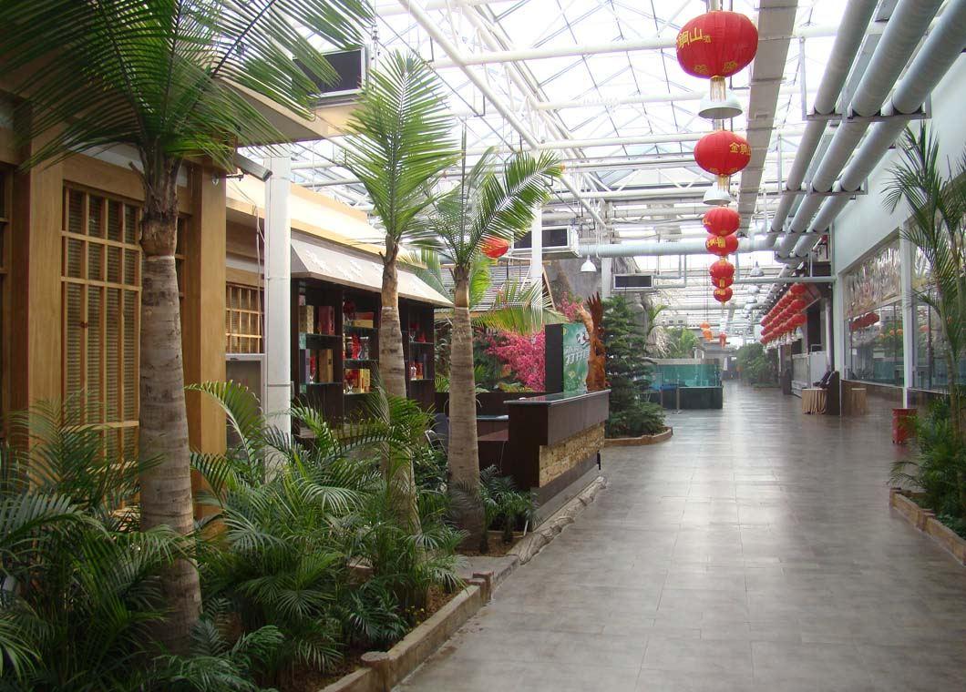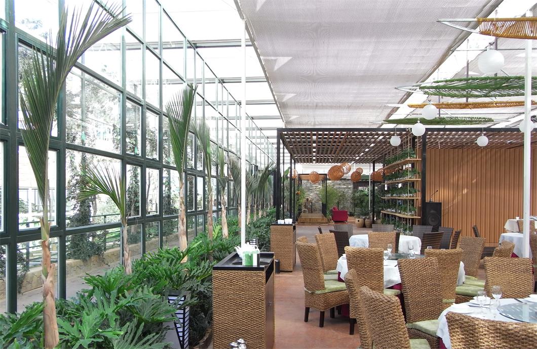 生態餐廳倡導的是一種新的休閑理念,通過現代化智能溫室和生態自然景觀的有機融合,營造一種舒適、綠色、健康的就餐環境;并通過配套設施,對室內溫度、濕度的有效控制,達到室內四季如春。餐廳的整個建筑就是一個大型連棟溫室,溫室內部利用人造景觀營造出一個室內花園的環境,有山,有水,有春色,室外大雪飄飄、寒風刺骨,室內鳥語花香、春意盎然,更多的是各式各樣的植被,傳統的餐桌就點綴在其中。